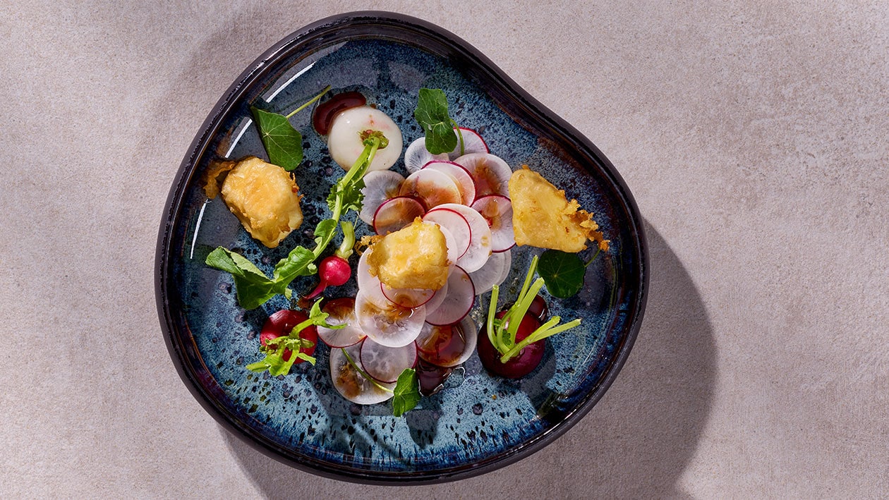 Gebackener Feta in rotem Miso mit Radieschen-Kapuzinerkresse Salat