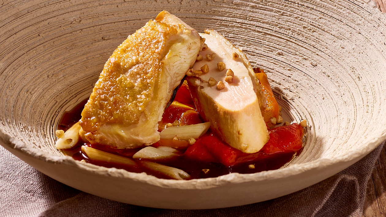 Knuspriges Maishähnchenbrust, Rotwein Sauce, Ofen-Parika und Penne