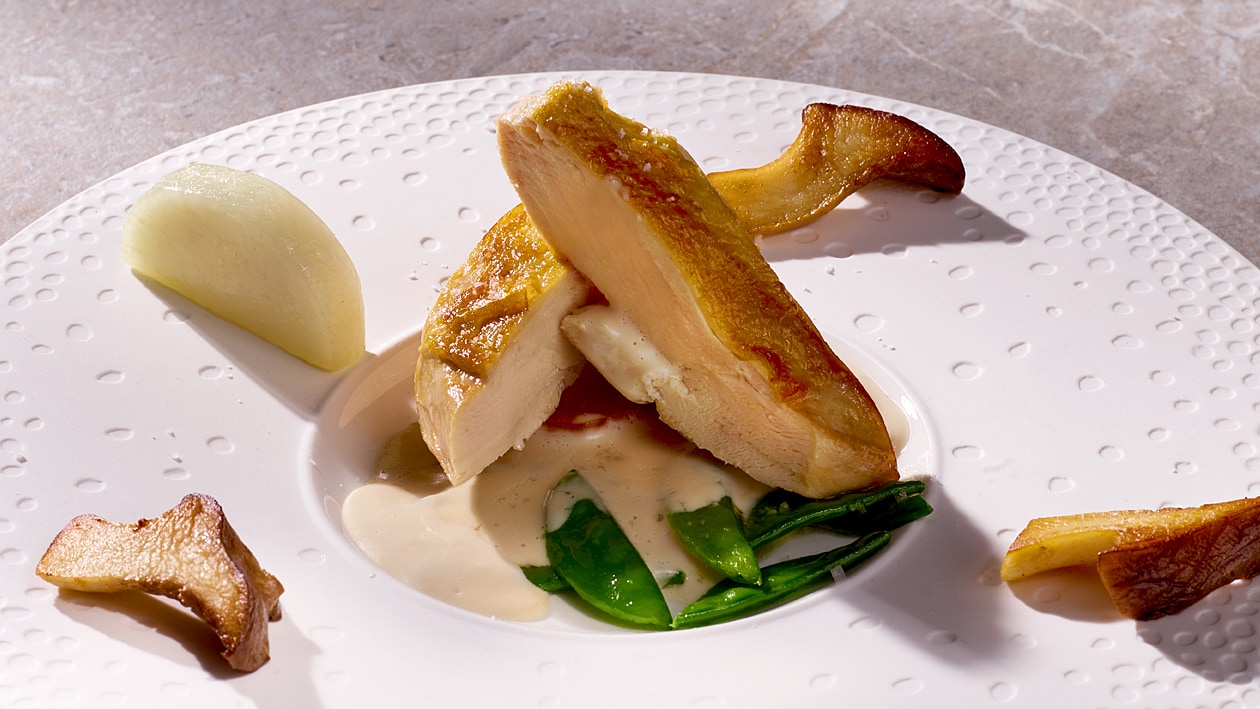 Maishähnchen Brust aus dem Ofen, Pilzsauce, Kaiserschoten-Kohlrabigemüse und gebratenen Kräuterseitlinge