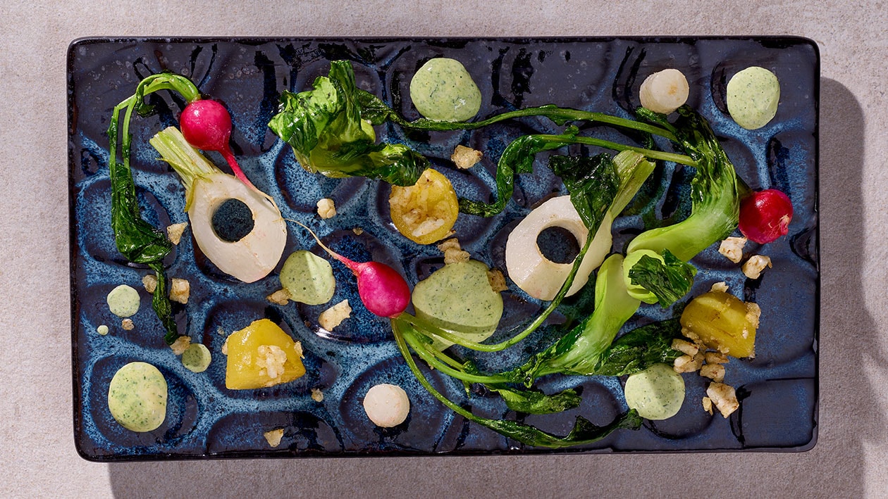 Radieschen-Mairübenpfanne, Sauce Bearnaise von der Öl Rauke, Reiskeks-Kartoffeln