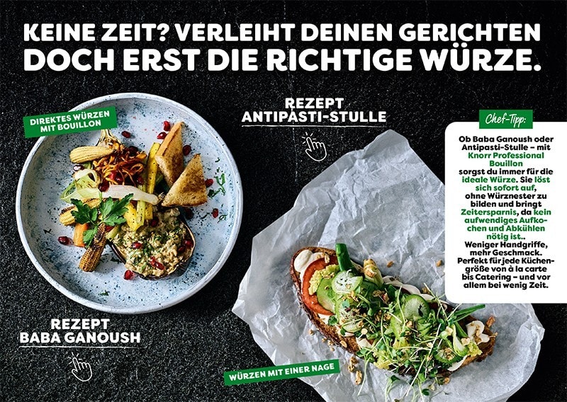 Ob Baba Ganoush oder Antipasti-Stulle - mit Knorr Professional Bouillon triftst du immer den richtigen Ton. Sofort löslich, ohne Würznester, spart Zeit und sorgt für die ideale Würze.