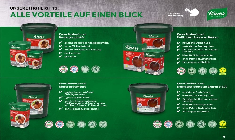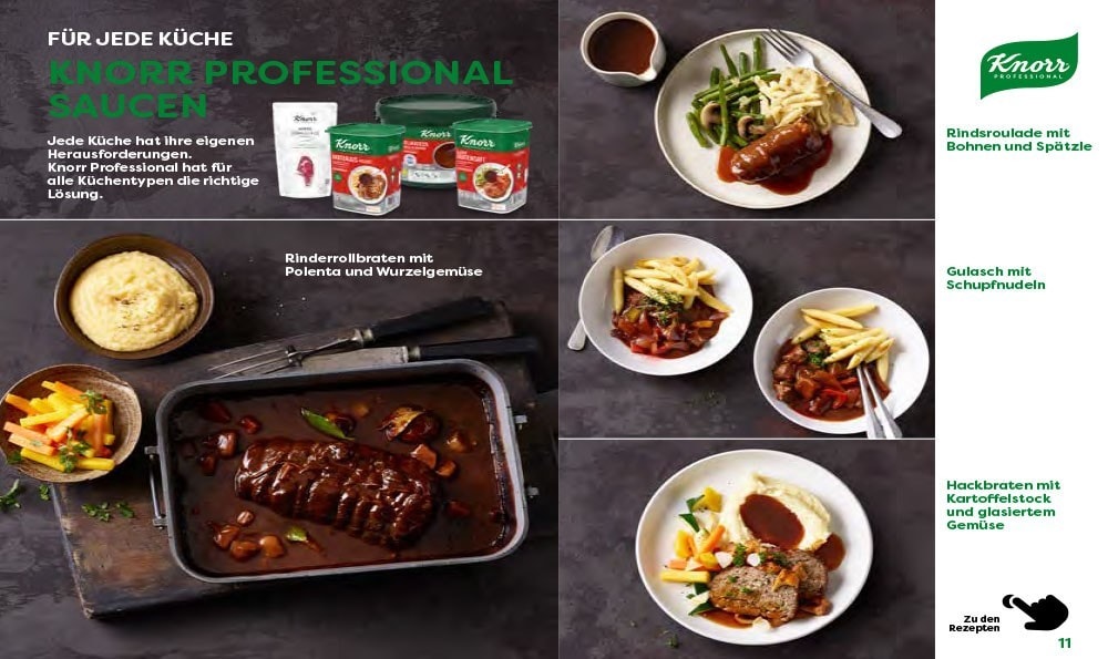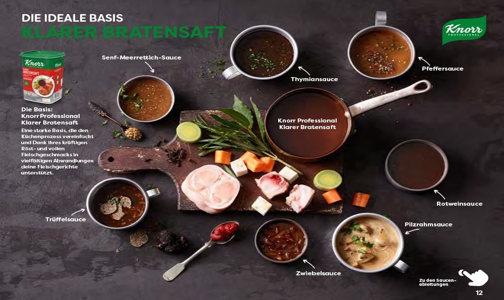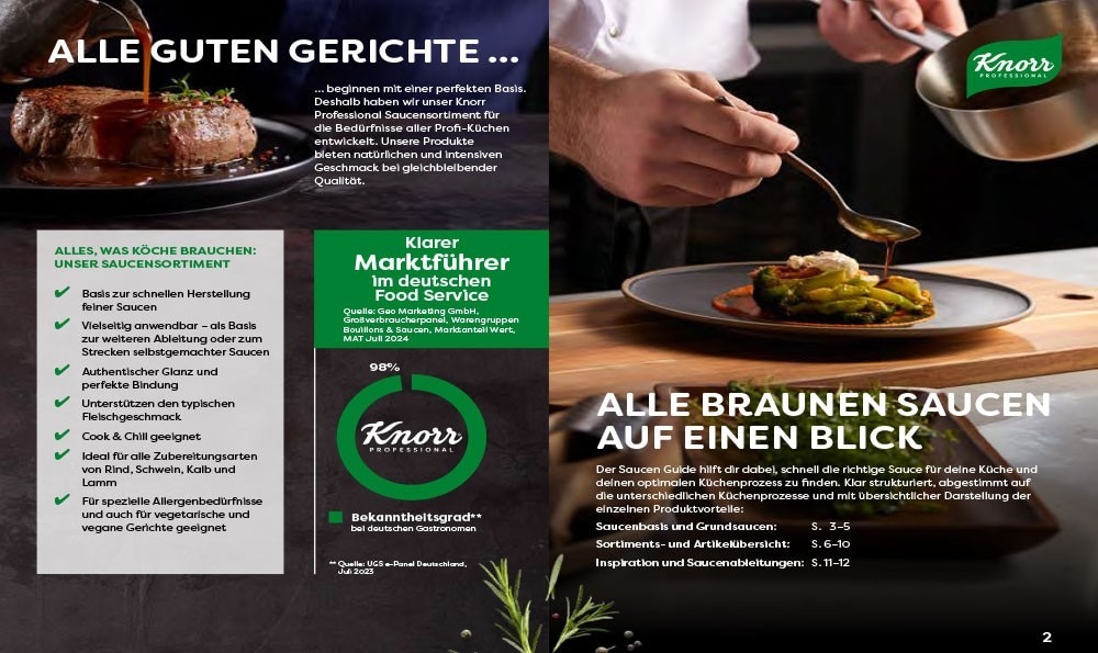 Eine gute braune Sauce braucht Zeit. Eine sehr gute braune Sauce braucht dagegen nur eine Basis aus dem vielseitigen Sortiment von Knorr Professional. Die Saucen bieten selbst in kleinen, eng getakteten Küchen jederzeit herausragende Qualität sowie ein intensives und authentisches Aroma. So bleibt mehr Zeit fürs Wesentliche: Das Veredeln von Gerichten und das Kreieren eigener Saucen-Ableitungen.